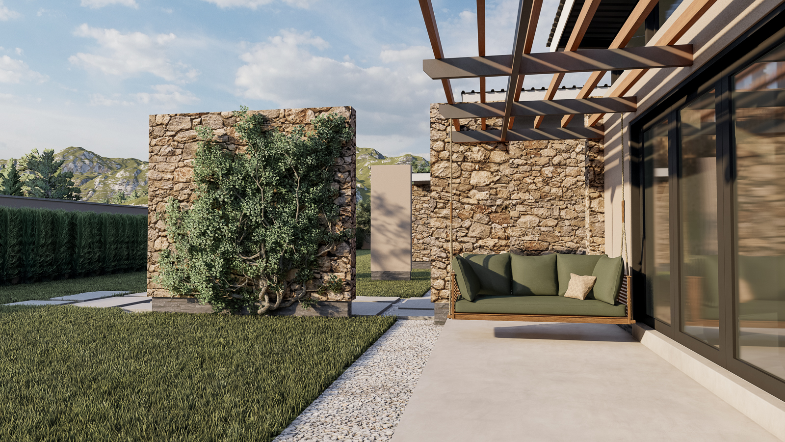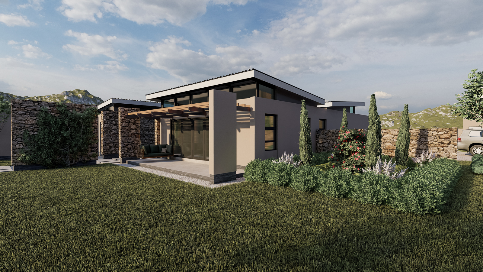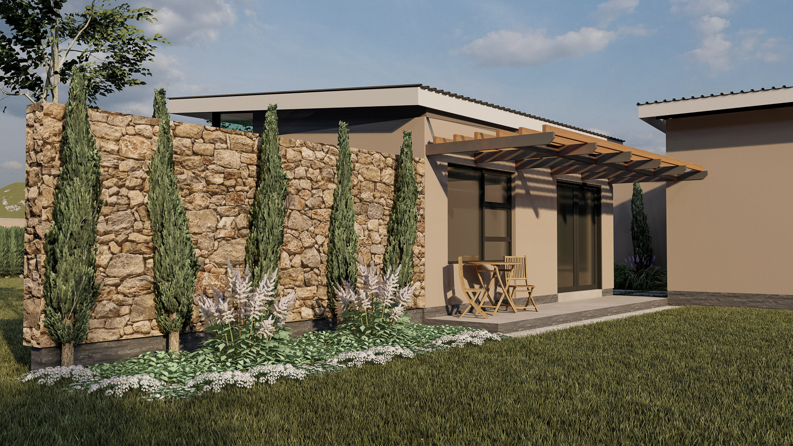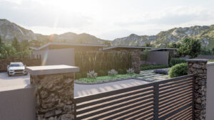 Set quietly against a gently rolling hillside, this single-story residence unfolds as a sequence of intimate pavilions, each bounded by warm, hand-laid stone walls that both shelter and reveal. Rather than a monolithic block, the home reads as an articulated compilation of well-organized spaces: a sheltered driveway framed by a low stone pier, a lush courtyard tucked between two wings, and a private garden pavilion set discreetly to one side. Here, every wall is both structure and landscape armature, guiding movement as surely as the paths of light that dance across their textured surfaces.