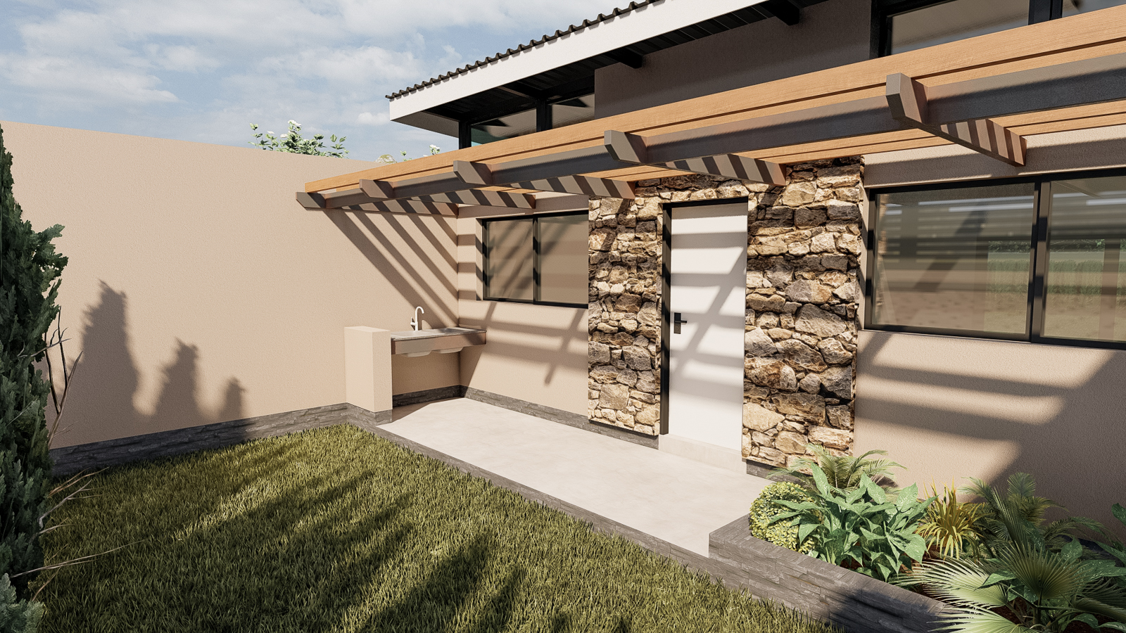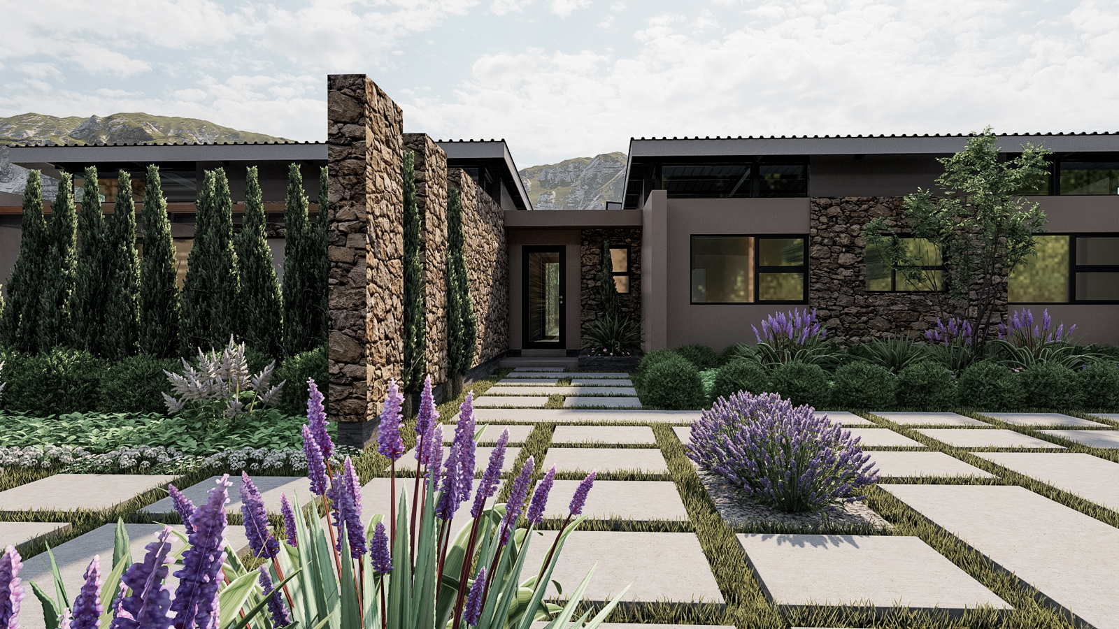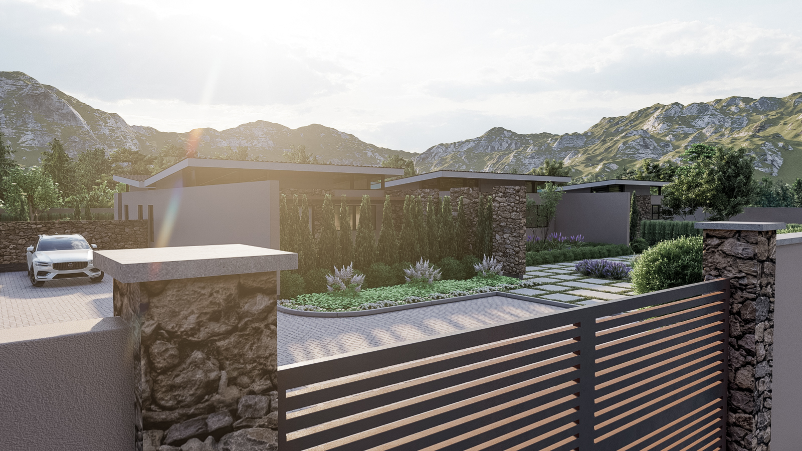 Set quietly against a gently rolling hillside, this single-story residence unfolds as a sequence of intimate pavilions, each bounded by warm, hand-laid stone walls that both shelter and reveal. Rather than a monolithic block, the home reads as an articulated compilation of well-organized spaces: a sheltered driveway framed by a low stone pier, a lush courtyard tucked between two wings, and a private garden pavilion set discreetly to one side. Here, every wall is both structure and landscape armature, guiding movement as surely as the paths of light that dance across their textured surfaces.