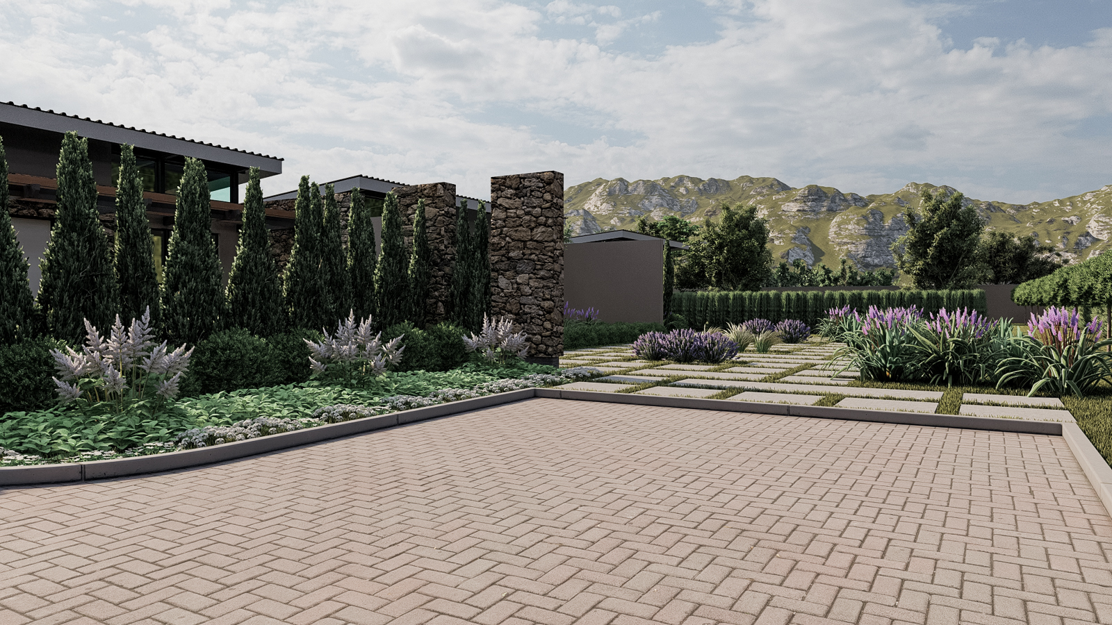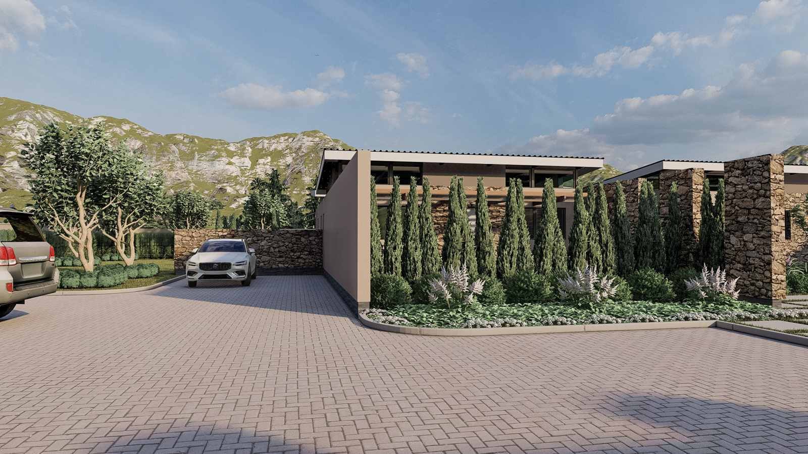 Connection to nature is woven into every joint and threshold. The living areas open onto stone-flagged terraces, where cushions of lavender and rosemary spill over low planters. Beyond the garden wall, olive and cypress silhouettes stand sentinel against the meadow, and the panorama of undulating hills becomes part of the living room décor. Even the modest driveway pavers, laid in a subtle herringbone, echo the rhythms of the surrounding fields.