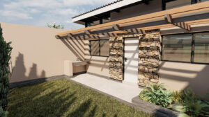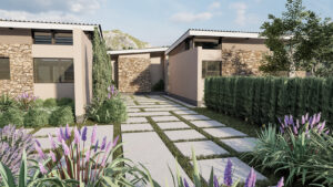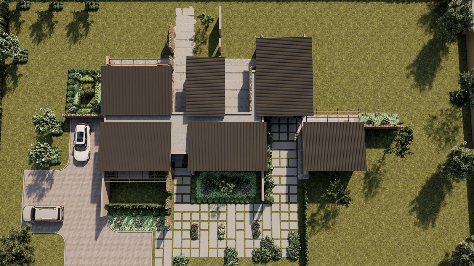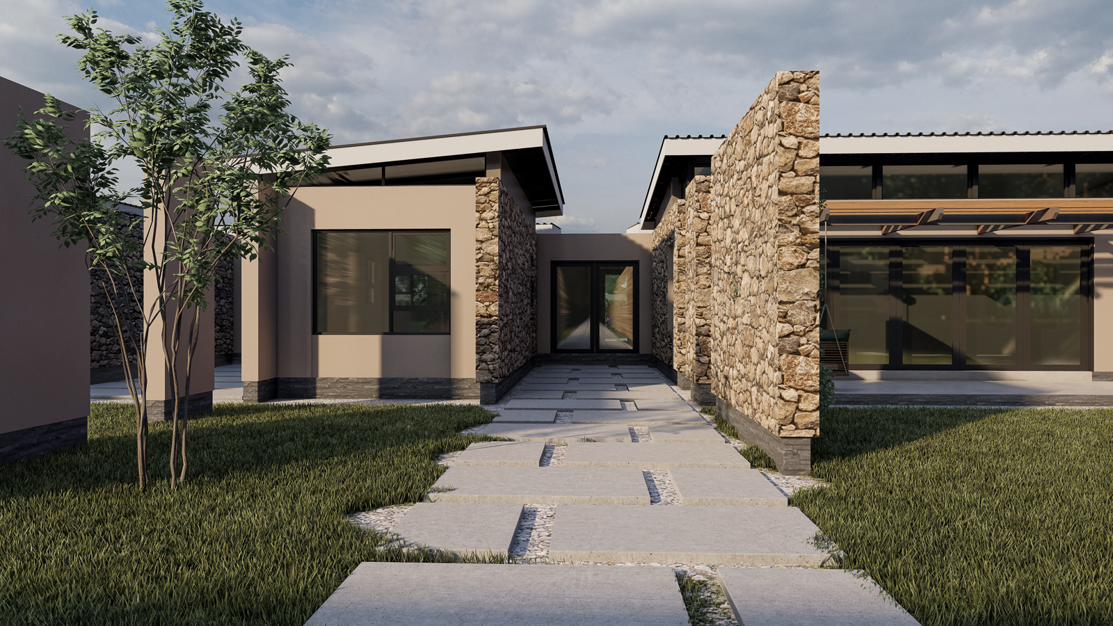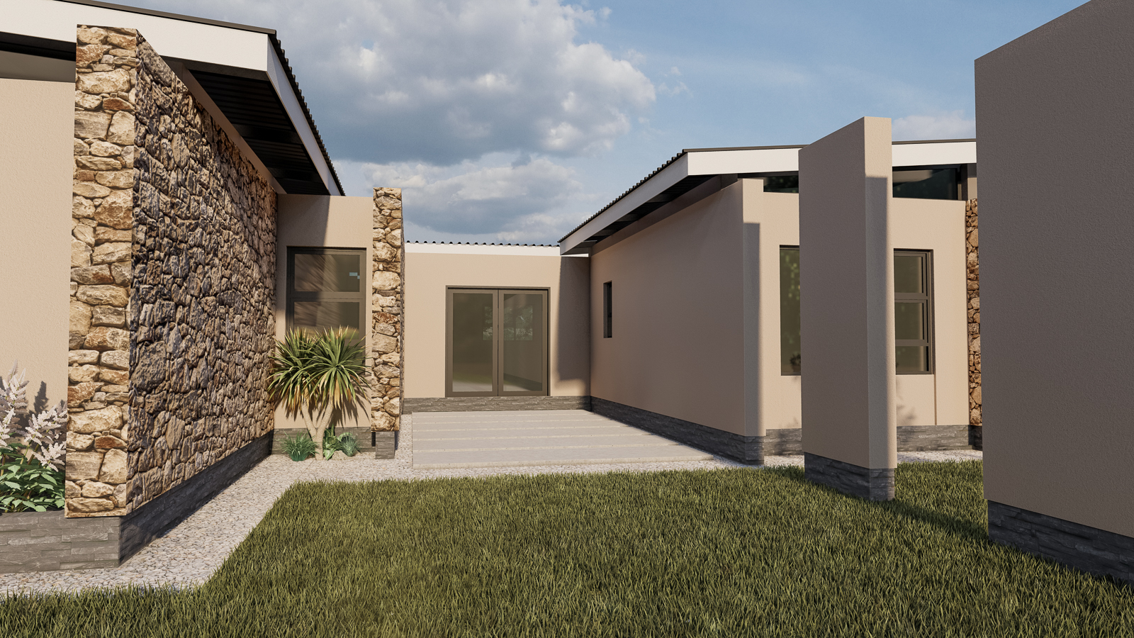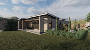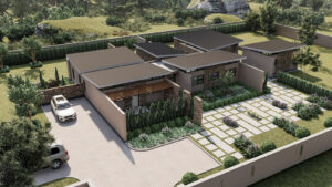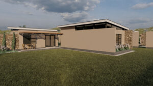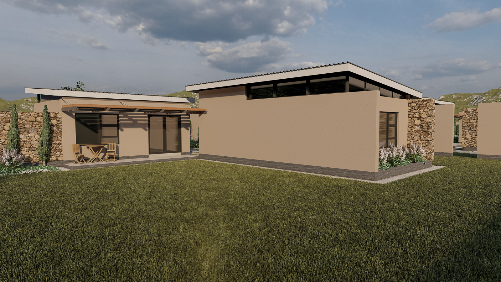 Above, slender monopitch roofs hover like paper planes caught in a summer breeze. Their deep overhangs and concealed gutters give the impression that they’re lightly levitating above the rooms below—a subtle flourish that lends the composition an almost ethereal lightness. From the interiors, clerestory windows sip southerly light; from the exterior, the slim rooflines draw the eye upward toward drifting clouds and distant limestone escarpments.