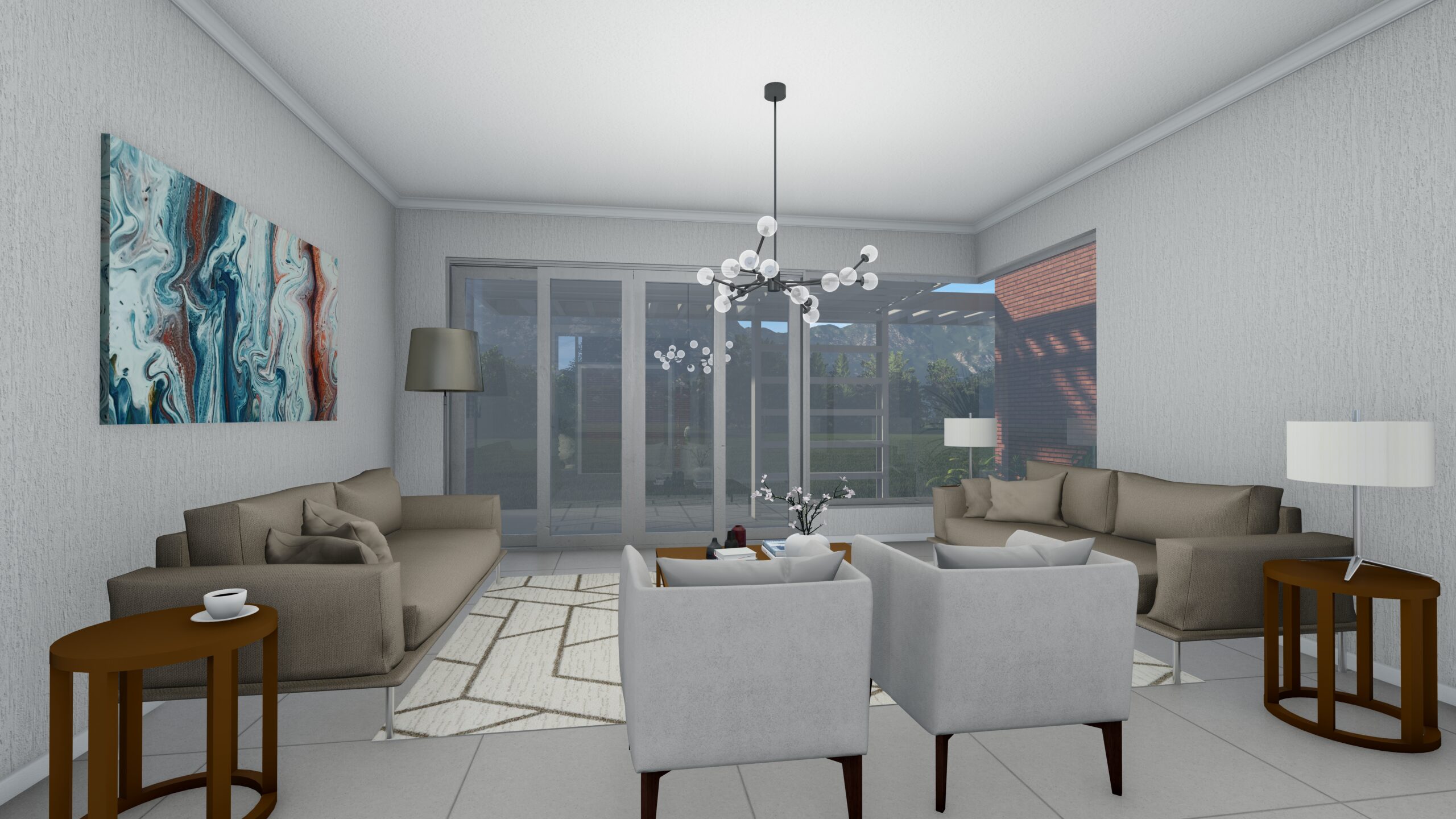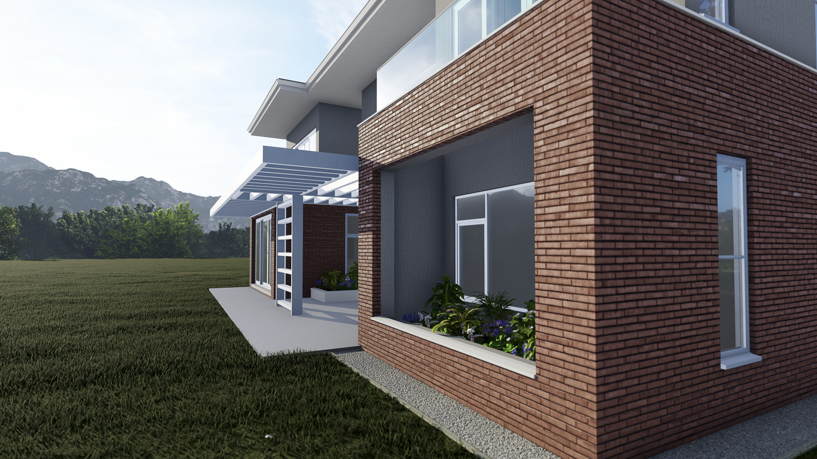 From the moment you arrive, a bold canopy and slender columns frame the entrance, softened by lush planting and natural stone accents. The warm facebrick base grounds the home in the landscape, while the lighter painted plaster above gives the upper floor a sense of lift and lightness. Expansive glazing and generous balconies invite natural light deep inside and open the home to surrounding greenery and mountain views. At the rear, the flowing connection between living spaces and the garden creates a perfect setting for both quiet mornings and lively gatherings.