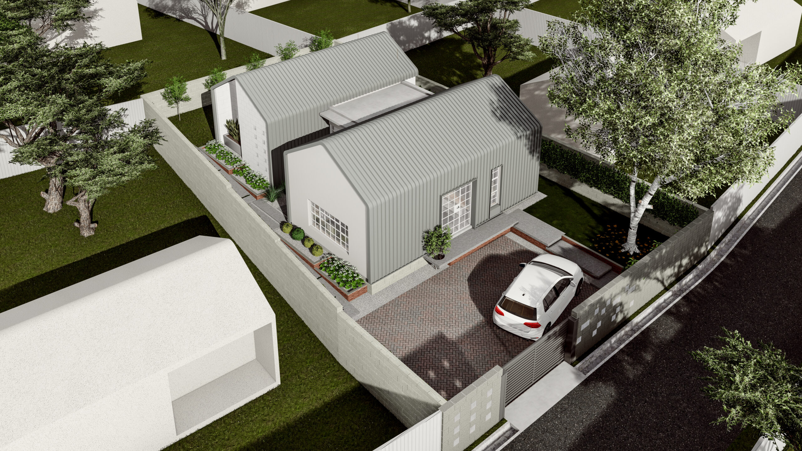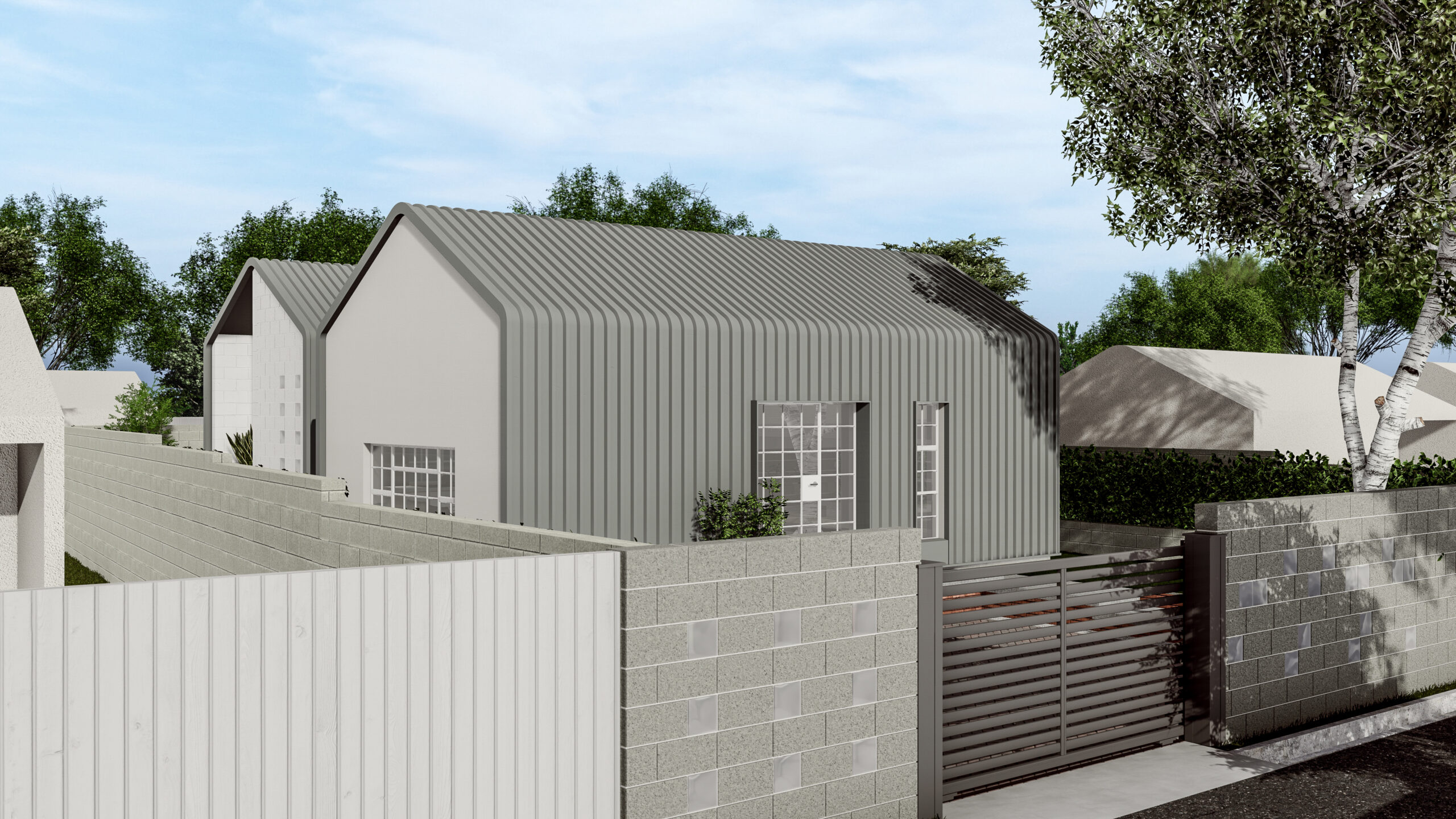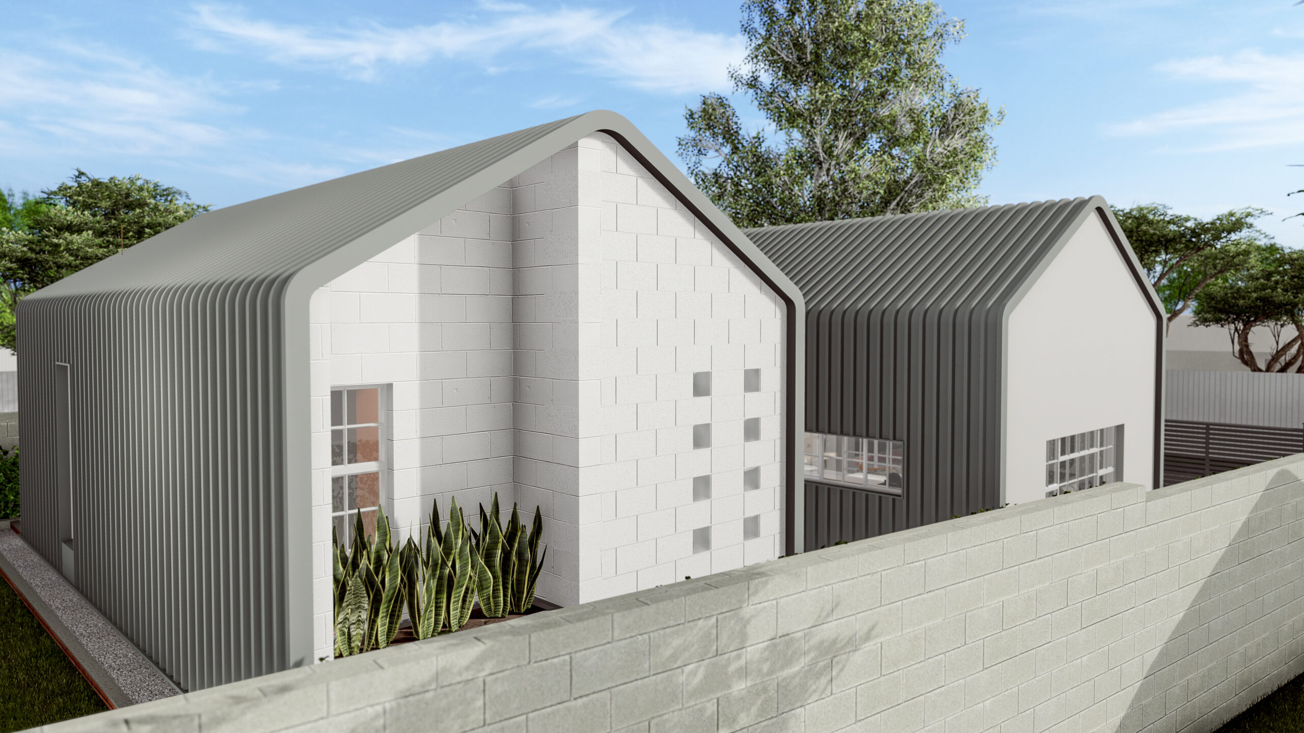 The design focused on using standard construction materials in atypical methods and placements whilst employing the skills of local artisans. This two-bedroom townhouse is constructed from concrete cinder blocks and fully clad in IBR roof sheeting. The IBR roof sheet is given a seamless look by cranking (rounding) the bends, creating a rounded ridge similar to the asbestos roof sheet ridge that was on the previous house.