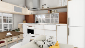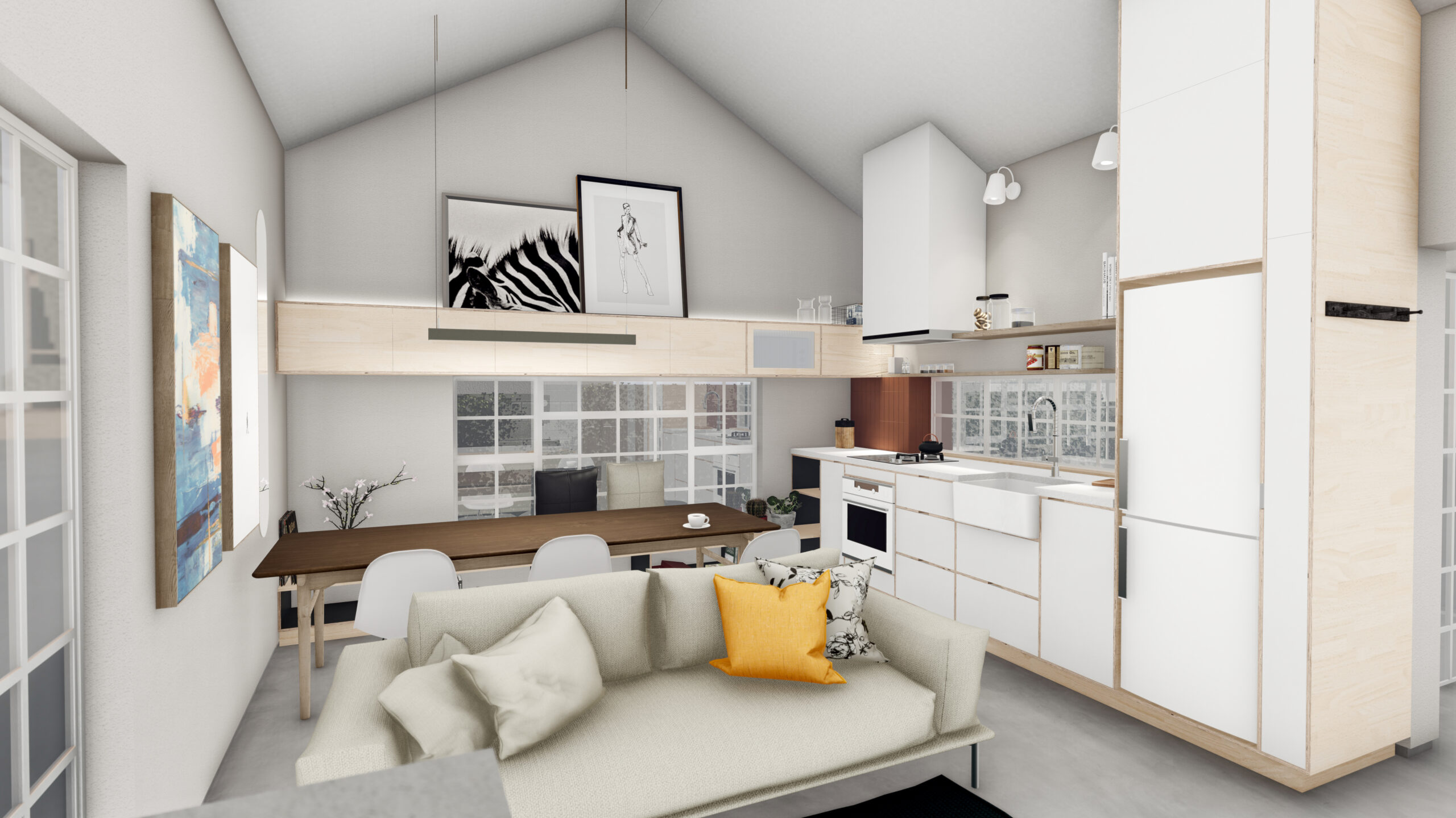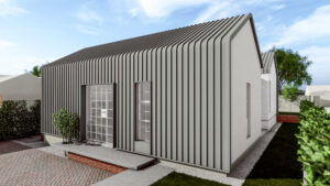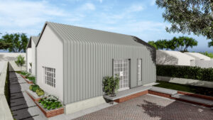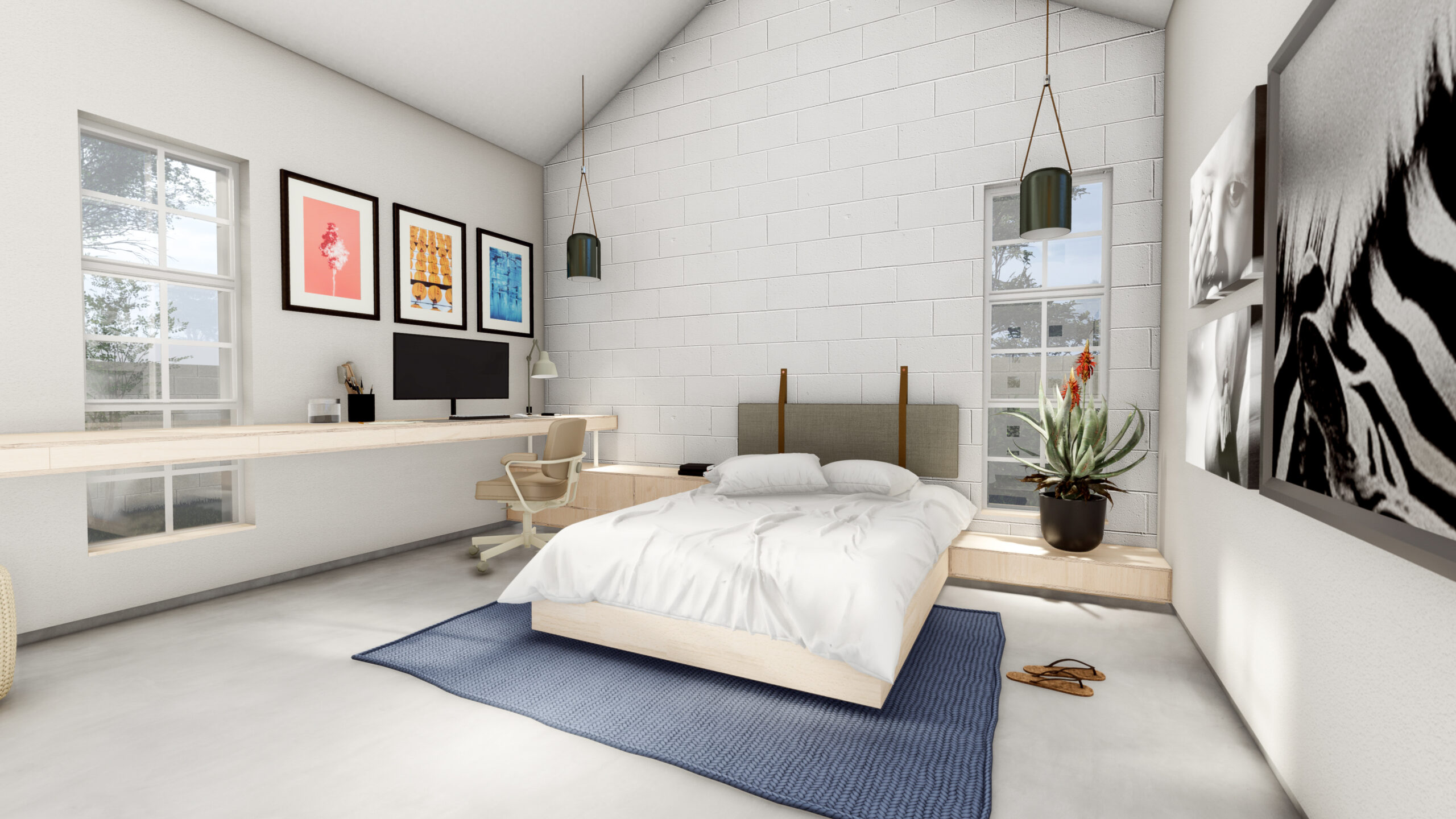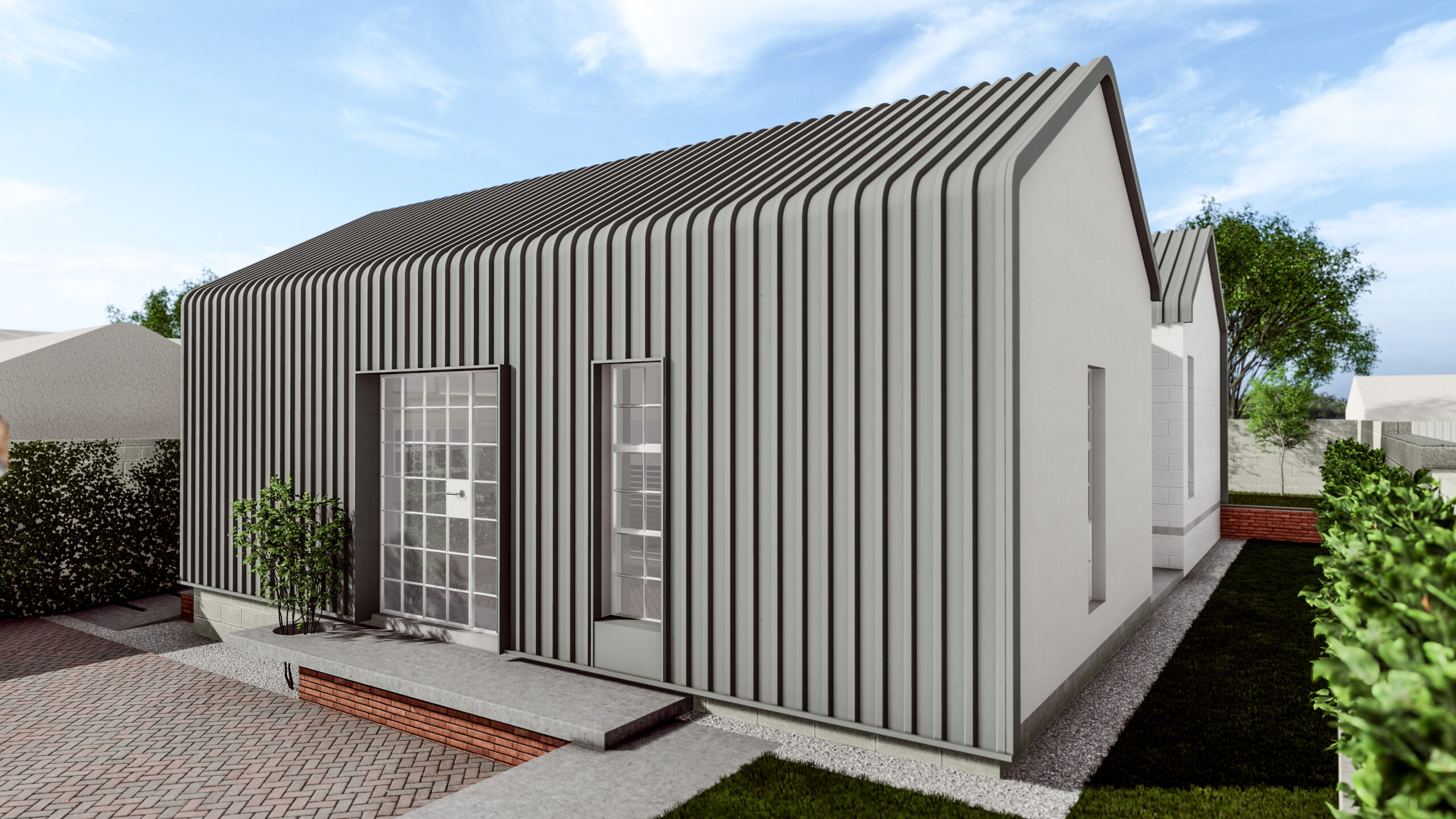 The design focused on using standard construction materials in atypical methods and placements whilst employing the skills of local artisans. This two-bedroom townhouse is constructed from concrete cinder blocks and fully clad in IBR roof sheeting. The IBR roof sheet is given a seamless look by cranking (rounding) the bends, creating a rounded ridge similar to the asbestos roof sheet ridge that was on the previous house.
